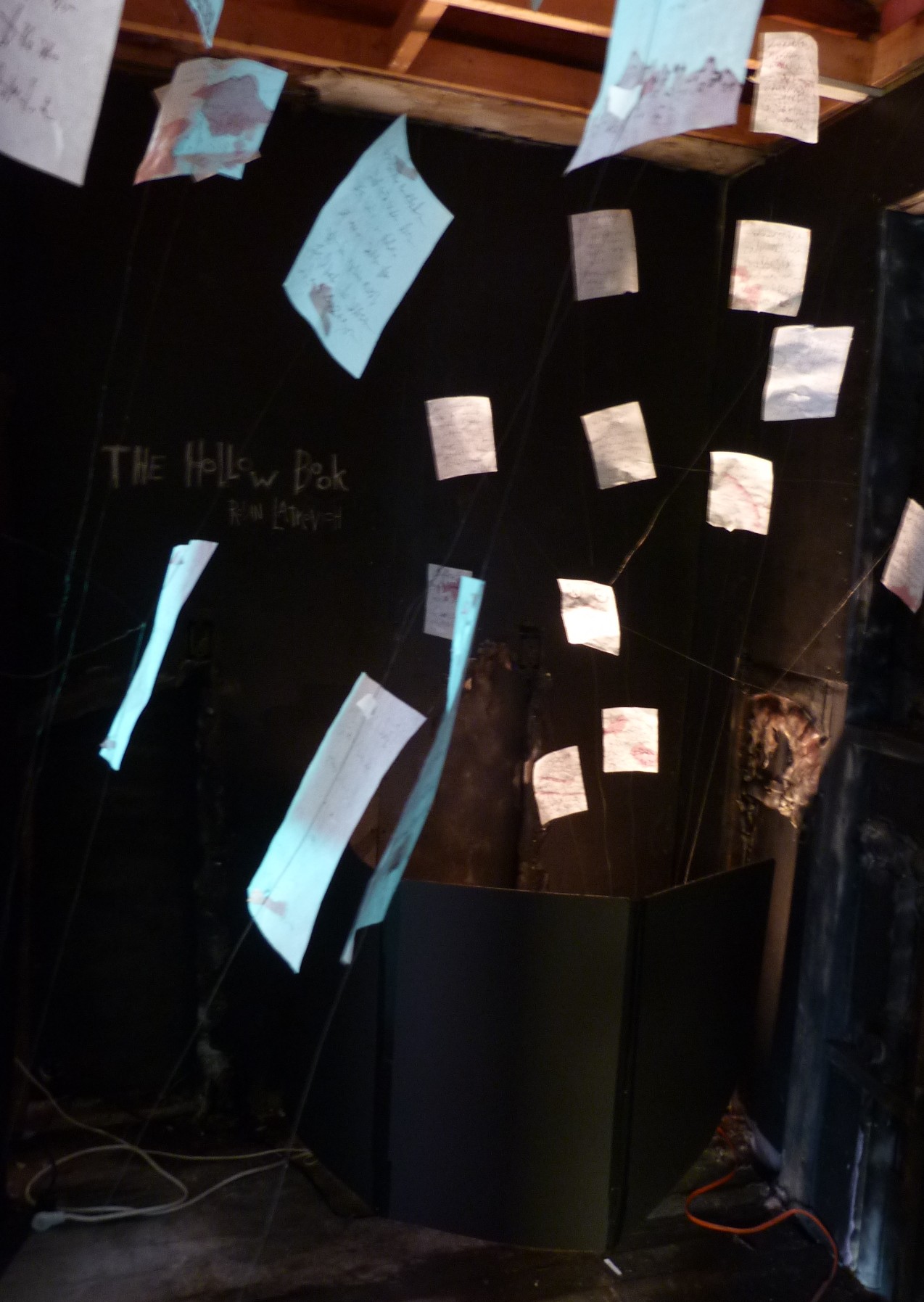 My latest installation, The Hollow Book, at the “Rooms to Let” temporary artspace. The event is located in a pair of foreclosed houses in Cleveland’s Slavic Village, and runs for only two days (5/16-17), making this installation more ephemeral than most. Fitting, given the setting.