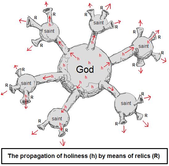 With these principles in sight, we may define relics as implements of controlled h-propagation. To our medieval votaries, the ultimate source of h was, of course, God, but this source was distant and therefore, like a faraway power plant, not reliable as a direct resource. Hence the need for an accessible system for the dissemination of this commodity, a system in which relics formed the ultimate “outlets”. We may map the flow of h thusly: